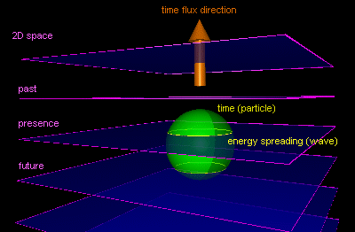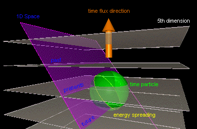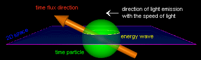 Here you can see the creation of a space-time distortion. (Well, I don't like the word 'distortion'.) You can also see that moving the time particle in the 2D dimesion you will get a reduction of the time flow speed in that 2D space. Mostly the time particle may be a combination of time and negative time (not anti-time), and so a bit more complicated.An introduction of a 5th dimension will set the time particle a specific livespan as also shown for the energy particle. The 5th and higher dimensions are therefore the perpetrators of energy wave creation in the 2D space.